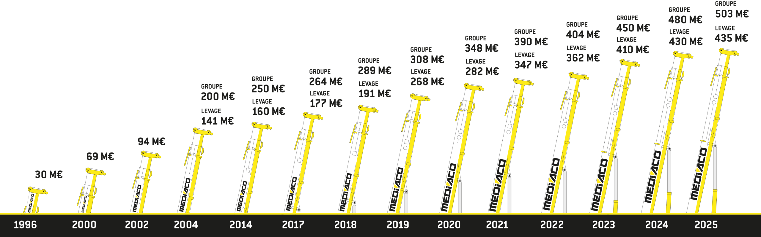Le Groupe Mediaco réalise un chiffre d’affaires de 503 M€ et enregistre une progression de +250 % sur les 11 dernières années pour l’activité levage (CA 2014: 160 M€ / CA 2025: 435 M€).